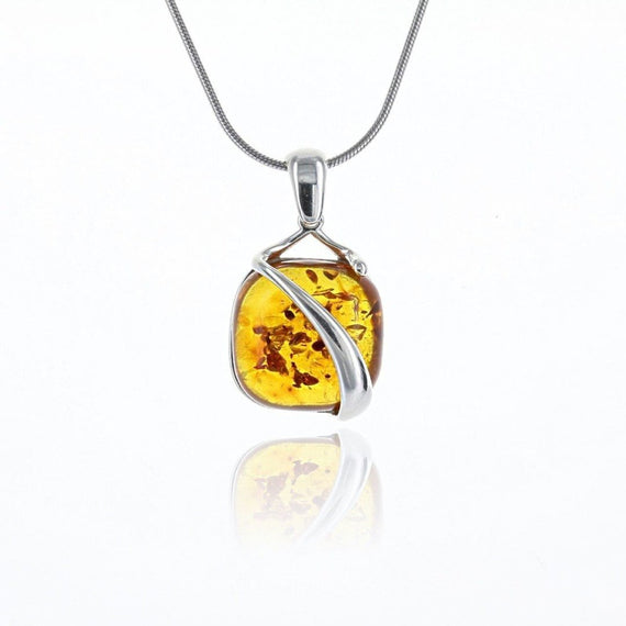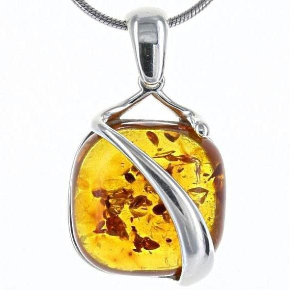 Height: .5″ Width: .5″ Bail: .25" Stone: Baltic Honey Amber Metal: .925 Sterling Silver in Rhodium Vermeil to prevent tarnish *The image may show slight differences in texture, color, size and shape **The natural properties and process of amber formation define the unique beauty of each piece Imported from Poland