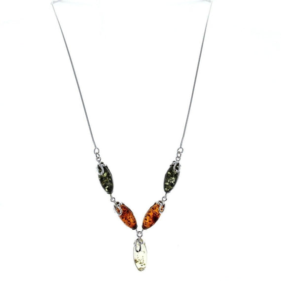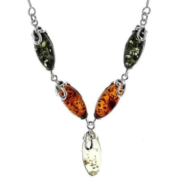 Tri-color (green, honey, citrine) amber pieces have been expertly set in .925 sterling silver. Lobster clasp closure. The image may show slight differences in texture, color, size and shape. The natural properties and process of amber formation define the unique beauty of each piece. Imported from Poland