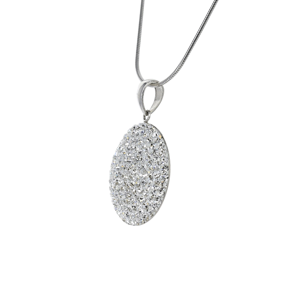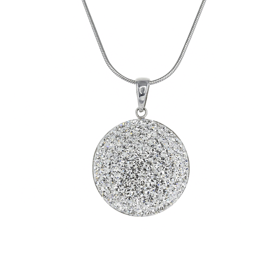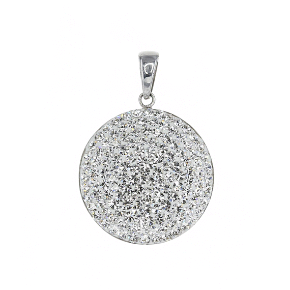 The domed shape of this pendant allows light to reflect off of the Preciosa Crystals from every angle, while the classic clear color gives a simple elegance to the piece.