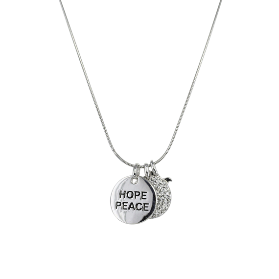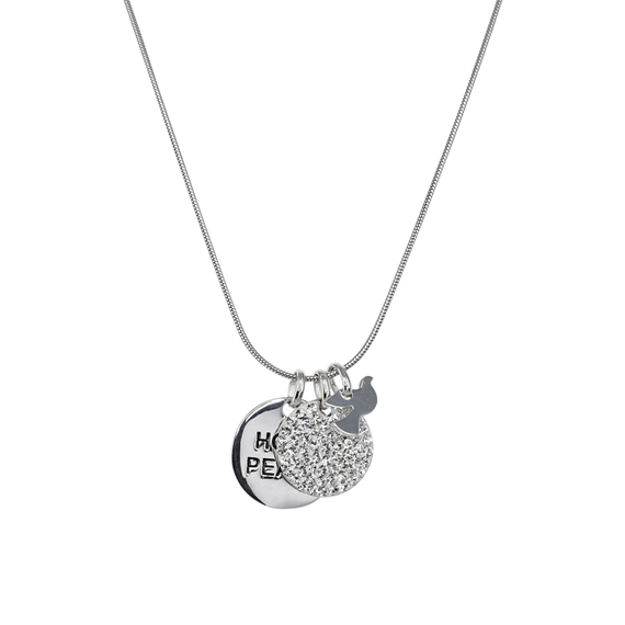 Stunning Swarovski crystals are arranged in a disc charm as an accent to the Sterling Silver charms including a small dove and "Hope Peace" disc.