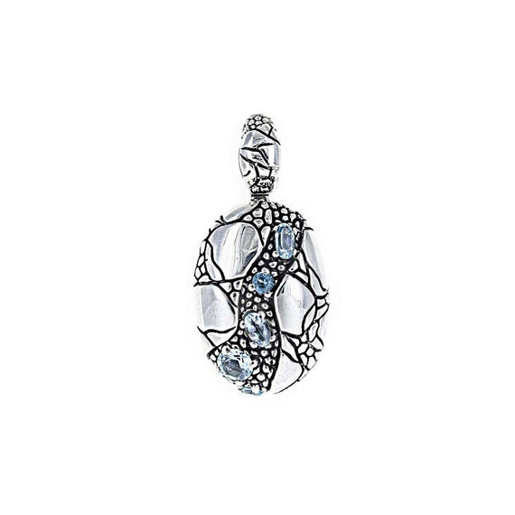 LIMITED EDITION: Beautiful blue topaz expertly set in hand-crafted sterling silver with leaf detail on front and custom David Beck Bali alligator relief scene on back. Truly a work of art.