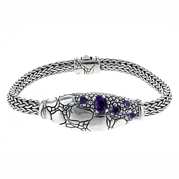 Gorgeous Balinese craftsmanship is on display with this stunning silver bracelet from David Beck Bali. Amethyst and silver leaf details are displayed in sterling silver.