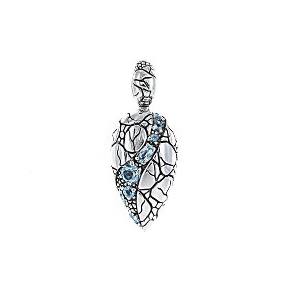 LIMITED EDITION: Beautiful blue topaz expertly set in hand-crafted sterling silver with leaf detail on front and custom David Beck Bali alligator relief scene on back. Truly a work of art.