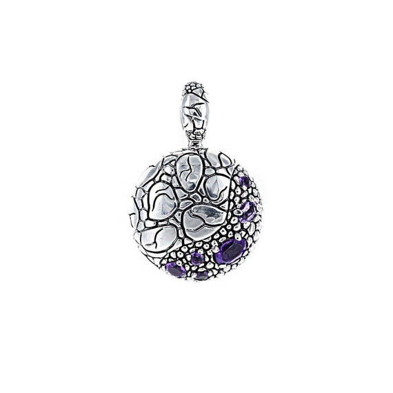 LIMITED EDITION: The aura of amethyst expertly set in hand-crafted sterling silver with leaf detail on front and custom David Beck Bali alligator relief scene on back. Truly a work of art.