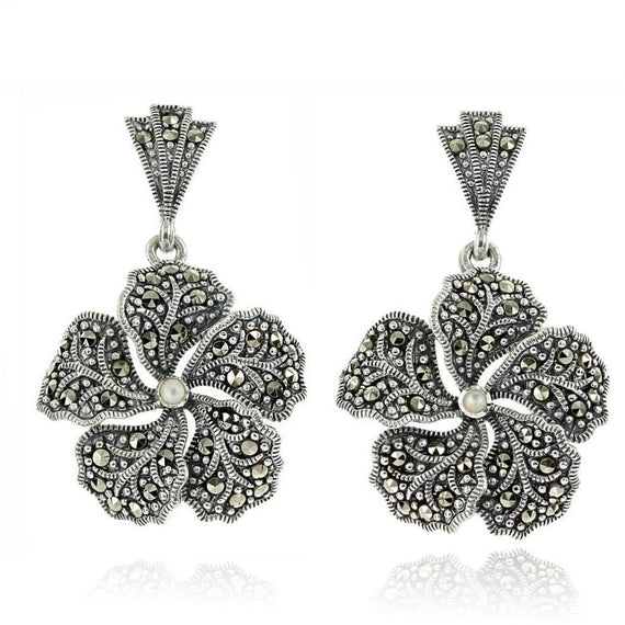 Height: 1" Width: 1" Drop: .25" Metal: .925 Sterling Silver Stone: Marcasite History: Marcasite jewelry has been made since the time of the Ancient Greeks. It came into fashion in the eighteenth century, the Victorian era and with Art Nouveau jewelry designers.