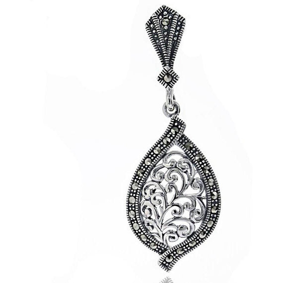 Height: 1.75" Width: .75" Metal: .925 Sterling Silver Stone: Marcasite History: Marcasite jewelry has been made since the time of the Ancient Greeks. It came into fashion in the eighteenth century, the Victorian era and with Art Nouveau jewelry designers.