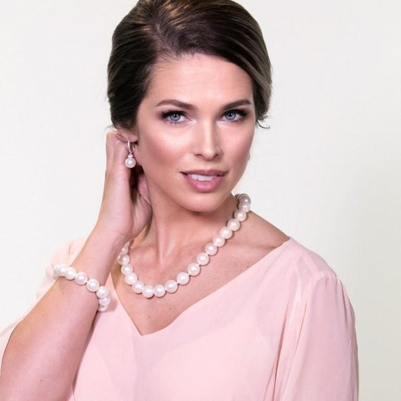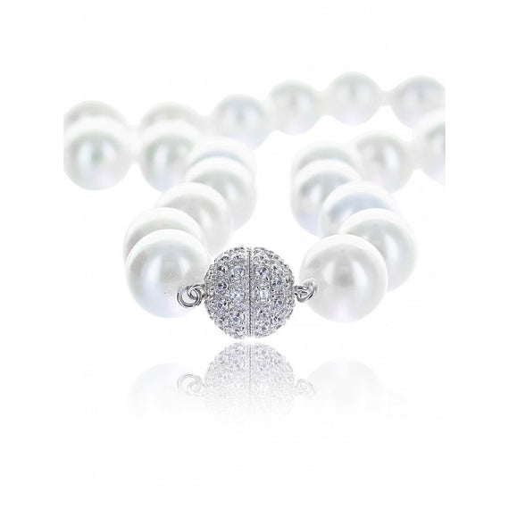 A stunning necklace crafted from genuine South Sea Pearl shells, flawlessly shaped and polished to perfection.  Features a sterling silver screw-down closure adorned with inlaid crystal, and individually hand-knotted, 14mm white mother-of-pearl beads forming a single 20" strand of unrivaled beauty and elegance.