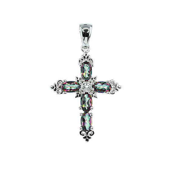 Mystic quartz in a stunning purple/green color has been cut into a beautiful oval shape and arranged in a cross, accented by shimmering white topaz that accentuates the vibrant color of the quartz. This pendant is sure to turn-heads in any casual or up-scale circumstance.
