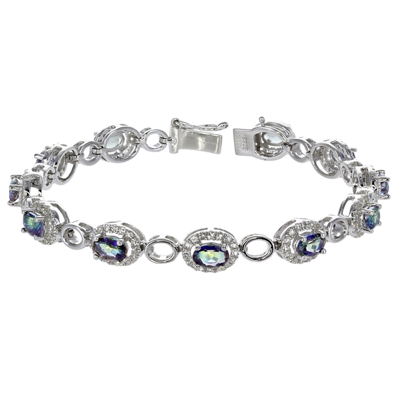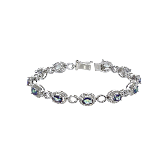 Beautiful blue mystic quartz has been cut into a delicate oval shape and set in a sterling silver setting. The stone has been set inside a shimmering white topaz halo, which accentuates the vibrant blue color of the quartz.
