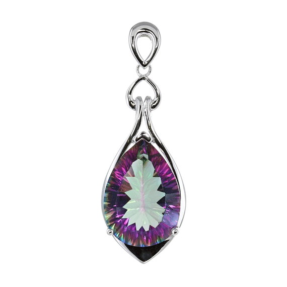 This large piece of Mystic Quartz has been cut in a teardrop shape set to create a simple pendant with a beautiful, detailed sterling silver setting.