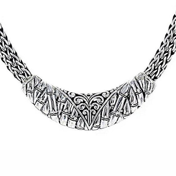 Gorgeous Balinese craftsmanship is on display with this stunning silver necklace from David Beck Bali. Hand-woven sterling silver and inspiration from the Island make this piece special. Thick silver makes a statment in formal or casual settings alike.