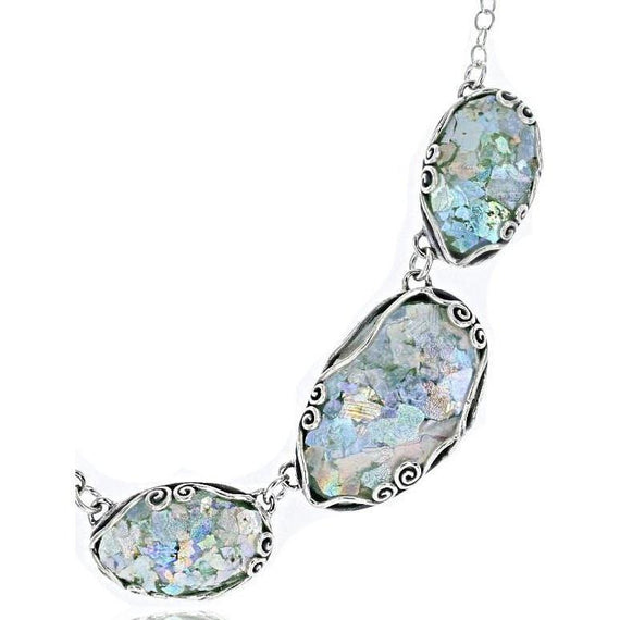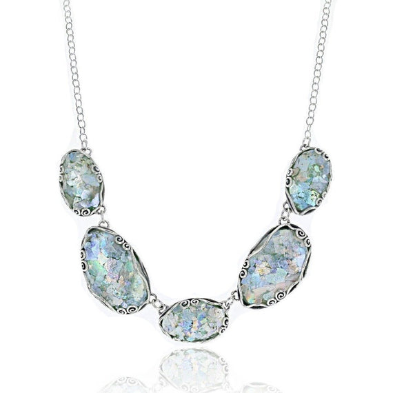 This impressive display of ancient Roman glass is sure to be a conversation piece. Five separate oval pieces of beautiful patina-covered glass have been expertly set in decorative sterling silver and suspended from a distinctive silver chain.