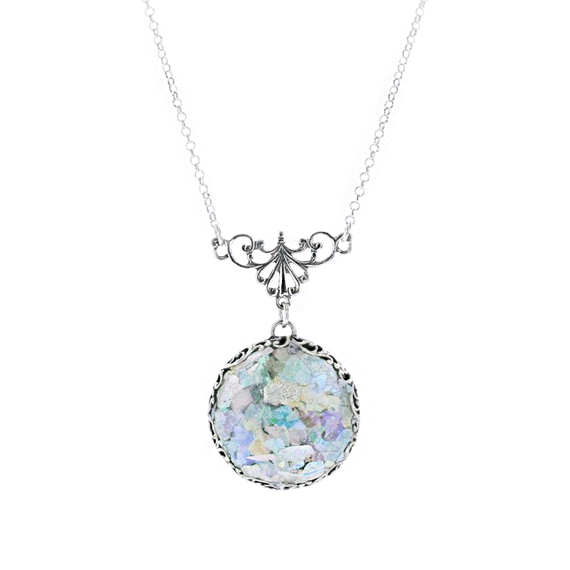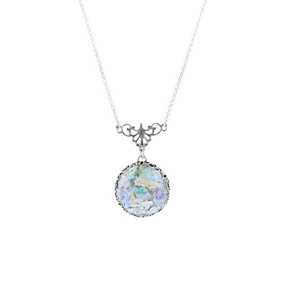A beautiful patina on the round Roman Glass piece is accented by the filigreed sterling silver setting. This necklace would make a lovely addition to any collection.