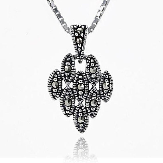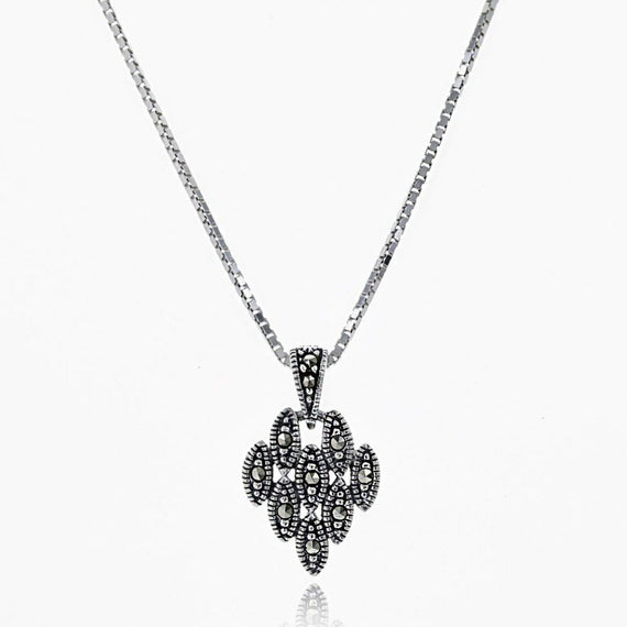 Necklace Length: 18" Length: .75" Width: .5" Metal: .925 Sterling Silver Stone: Marcasite History: Marcasite jewelry has been made since the time of the Ancient Greeks. It came into fashion in the eighteenth century, the Victorian era and with Art Nouveau jewelry designers.
