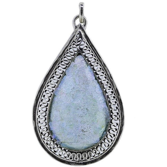 Pendant is 2 inches in length and 1 inch in width. Glass piece is 1 1/4 inches in length and 3/4 of an inch in width. Bringing History to Life Roman Glass Jewelry is made of 2000-year-old Roman glass that has been excavated from sites around Israel and brought back to life as heirloom-quality jewelry. Each piece is a unique and distinctive treasure. The glass is set by hand in the finest sterling silver. Made in Israel Certificate of Authenticity Included. For more information, Visit our Roman Glass Education page.