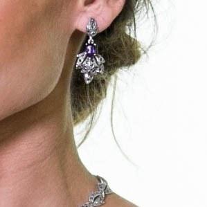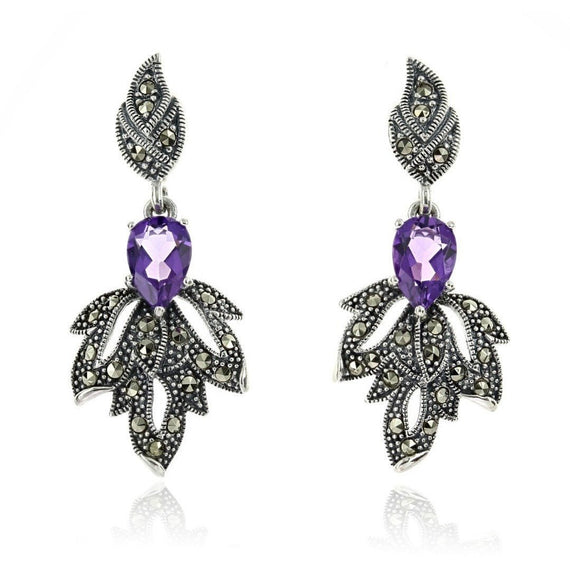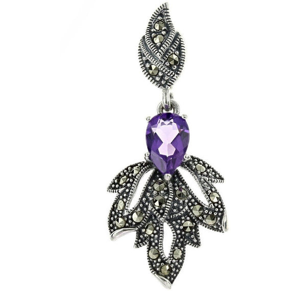 Height: 1.55" Width: .75" Metal: .925 Sterling Silver Stone: Marcasite Accent: Amethyst History: Marcasite jewelry has been made since the time of the Ancient Greeks. It came into fashion in the eighteenth century, the Victorian era and with Art Nouveau jewelry designers.