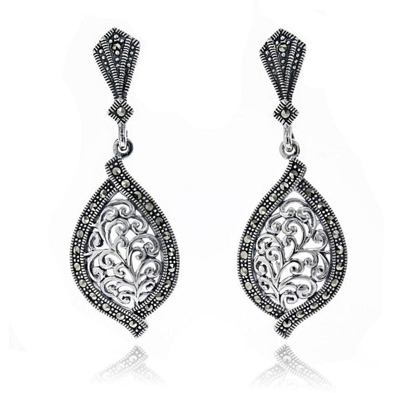 Height: 1.75" Width: .75" Metal: .925 Sterling Silver Stone: Marcasite History: Marcasite jewelry has been made since the time of the Ancient Greeks. It came into fashion in the eighteenth century, the Victorian era and with Art Nouveau jewelry designers.
