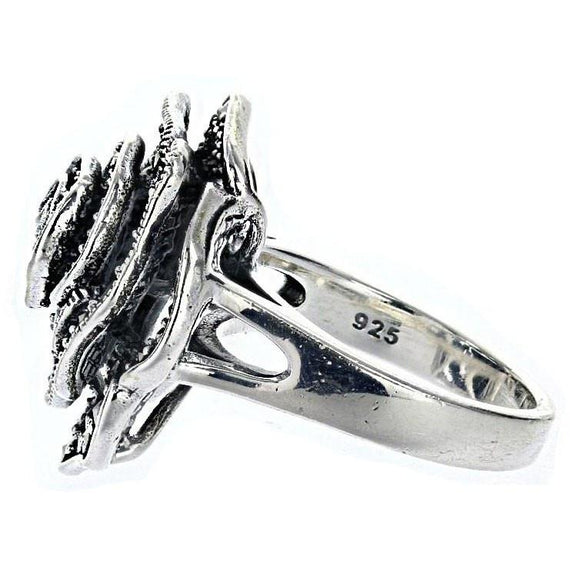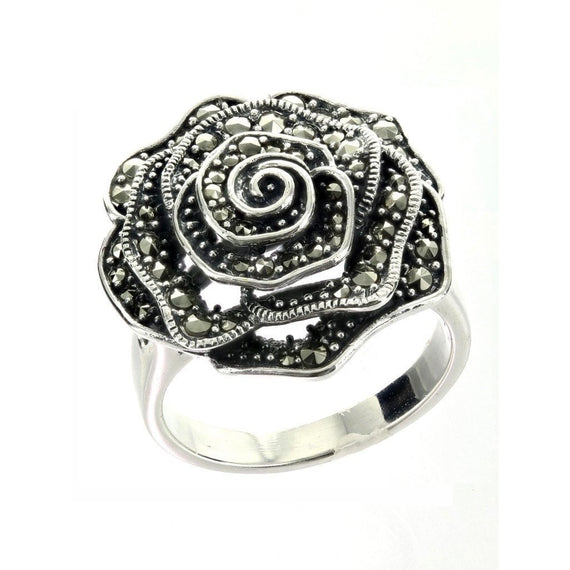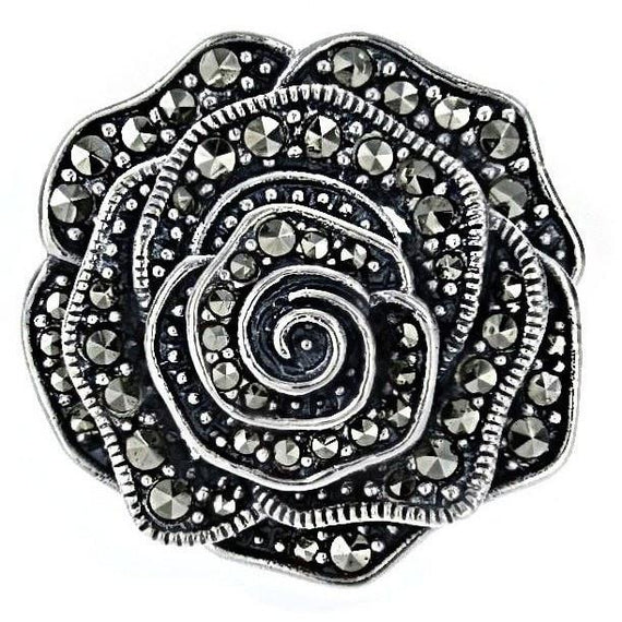 Rose measures approx. 1" x 1" Metal: .925 Sterling Silver Stone: Marcasite History: Marcasite jewelry has been made since the time of the Ancient Greeks. It came into fashion in the eighteenth century, the Victorian era and with Art Nouveau jewelry designers.